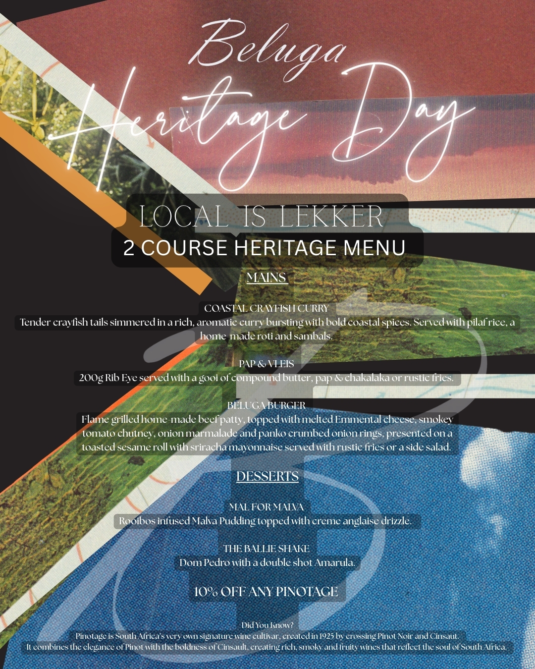 Local is lekker at Beluga! Enjoy a 2-course Heritage menu for R320 pp and receive 10% off any Pinotage. Don’t forget to dress to impress in your most heritage-inspired outfit for a chance to win, and take home a bottle of Pinotage.